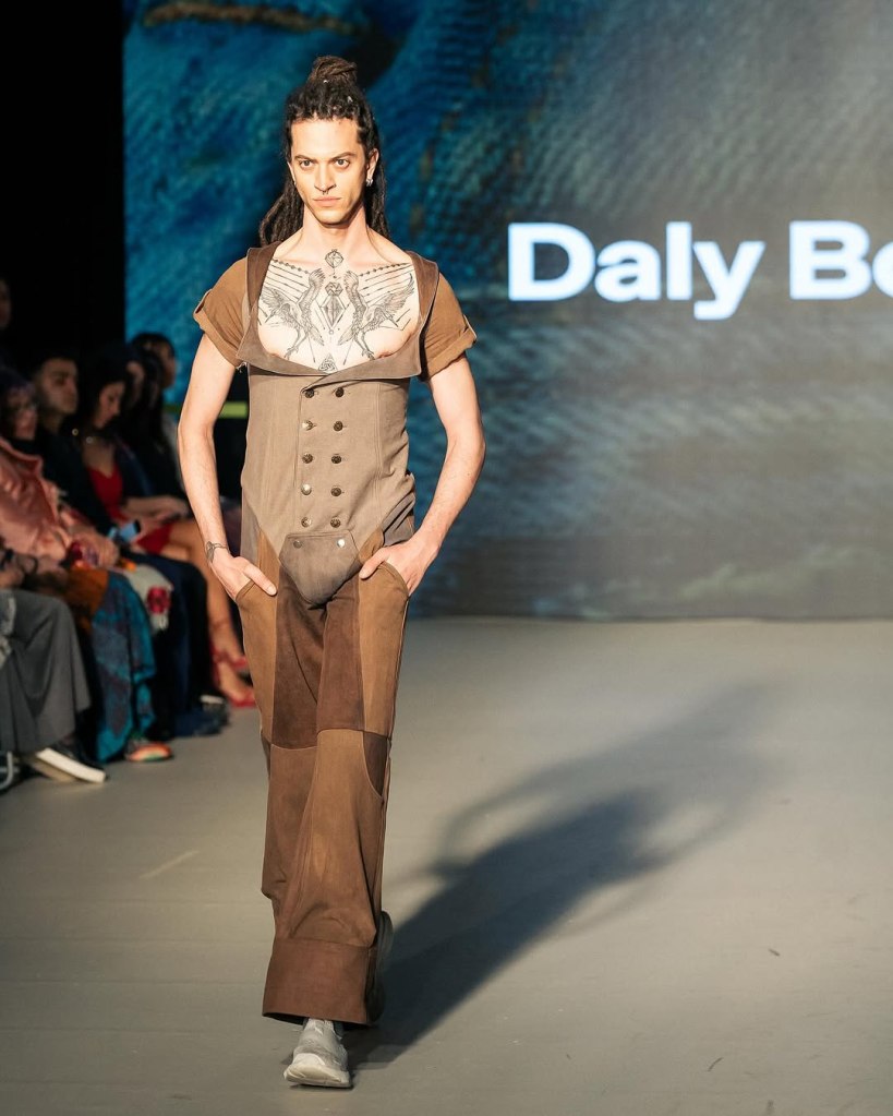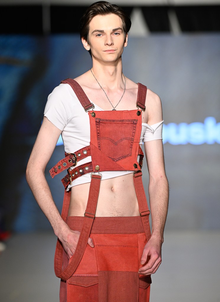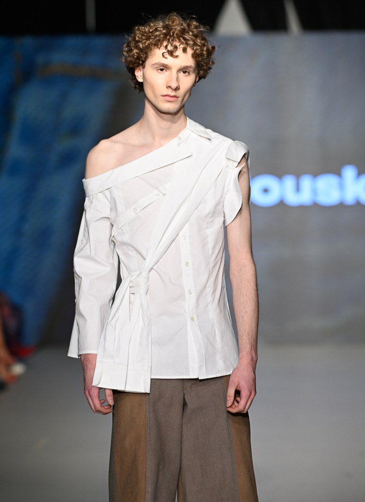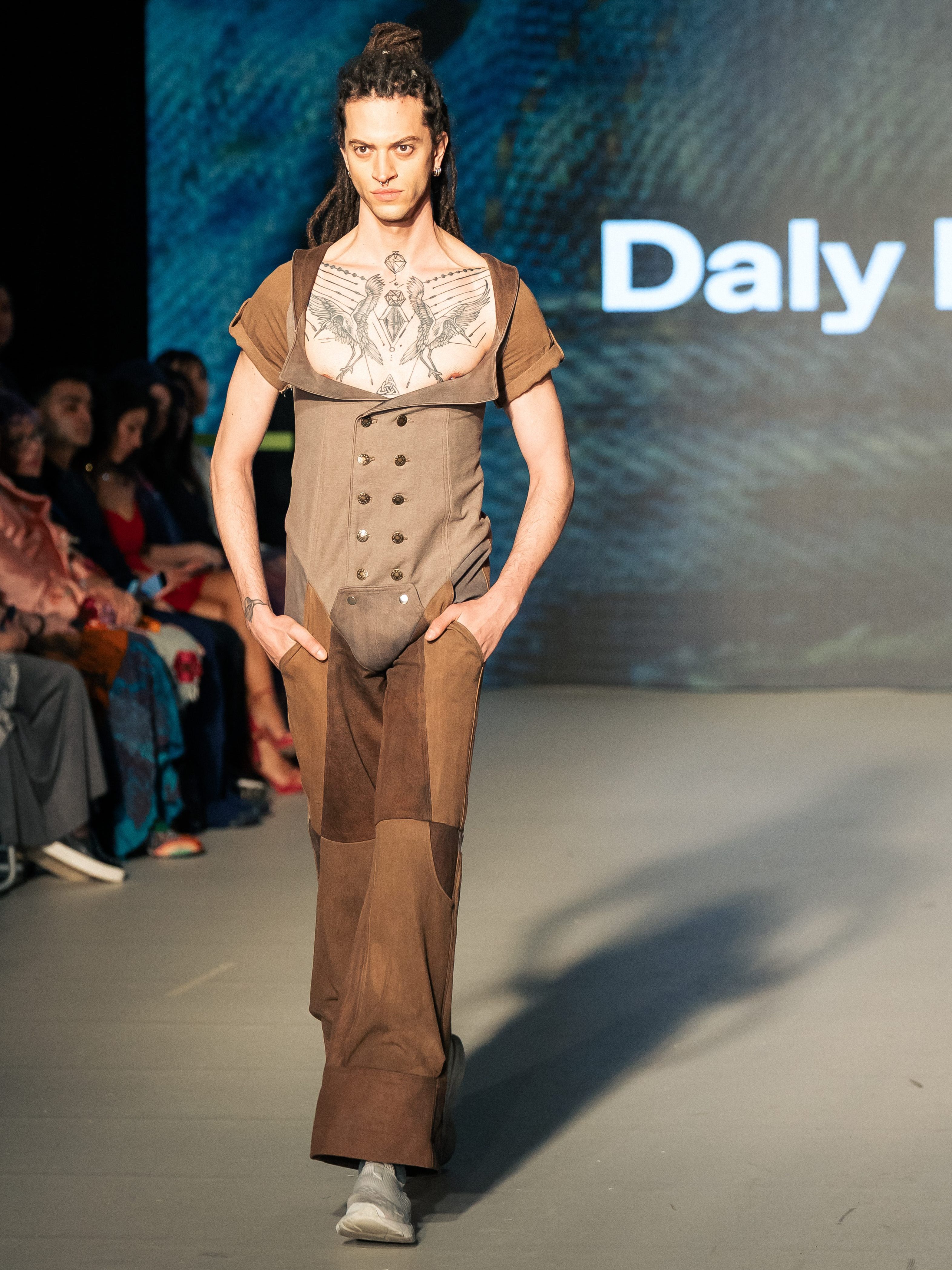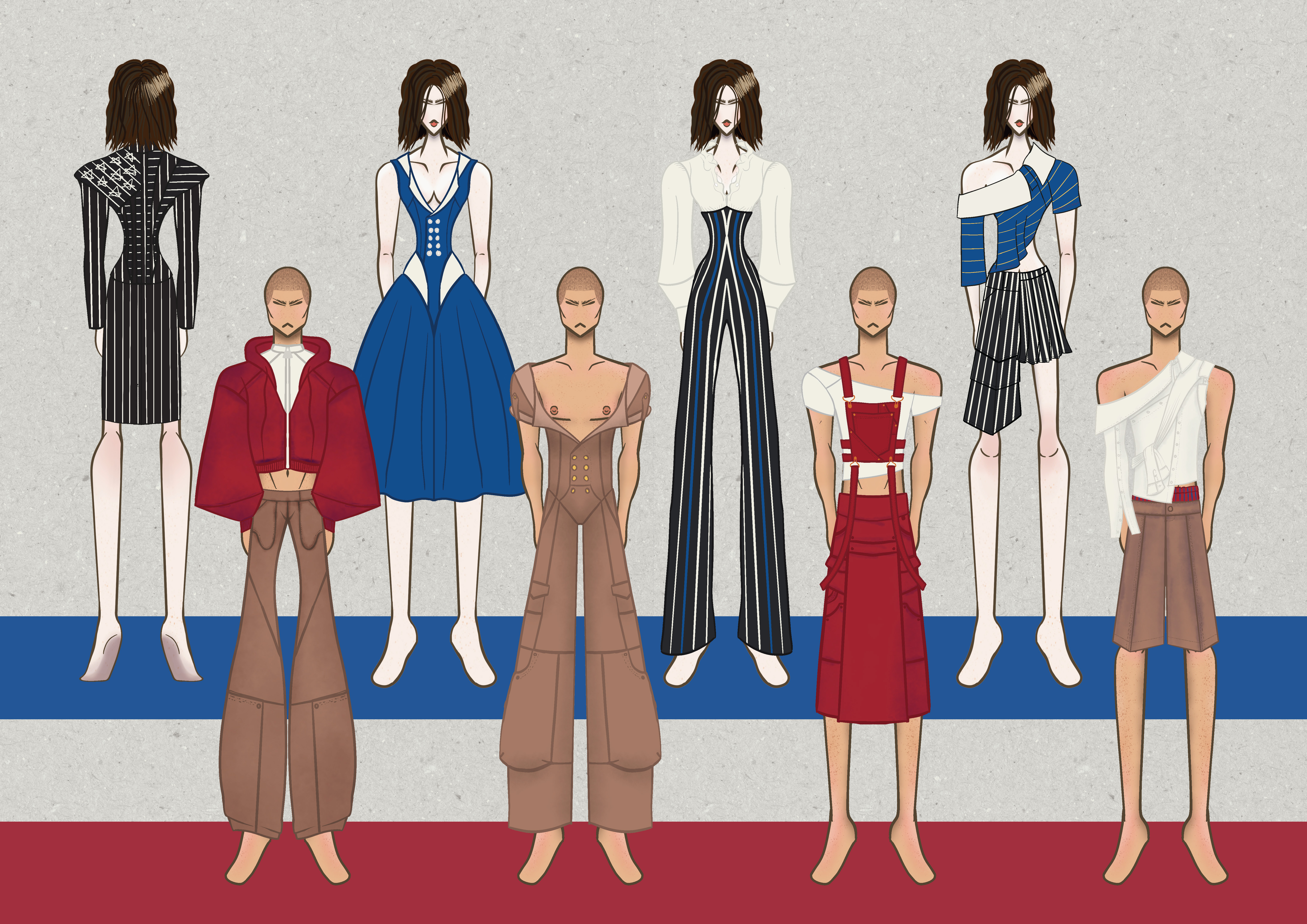 A divided world deserves divided fashion. Schism slices through gender norms and political posturing with a collection that flips the script. Feminine silhouettes are dressed in conservative motifs; masculine forms wear liberal flair. Satirical, subversive, and sharply tailored, each look is a statement on the absurd theatre of division.